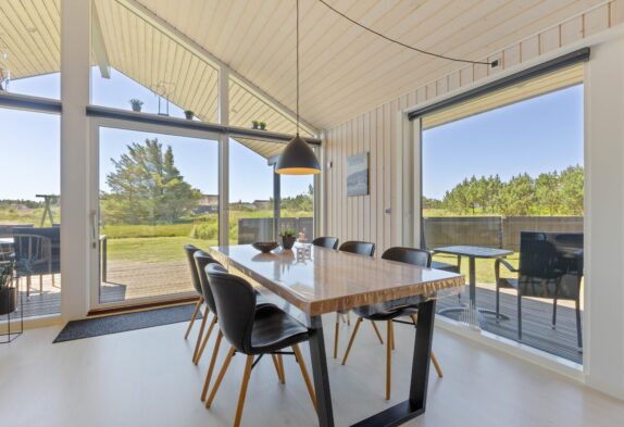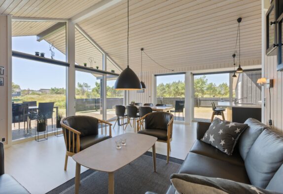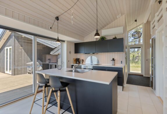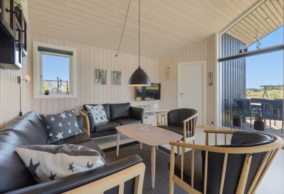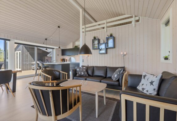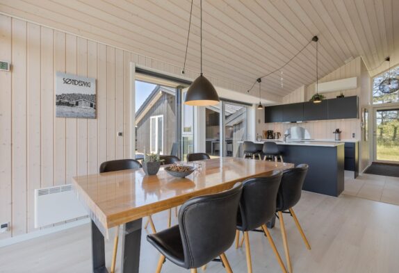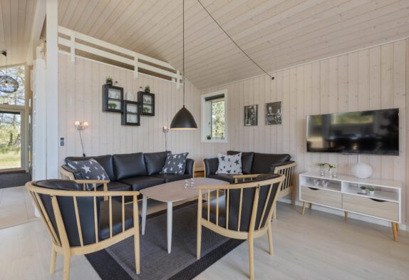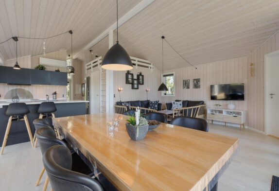De lyse trælofter, gulve og vægge sørger for en venlig atmosfære, hvor I fra første ferieøjeblik vil føle jer godt tilpas. I det kombinerede opholdsrum med stue, køkken og spiseafdeling er rammerne sat for en ferie med masser af samvær og fællesskab.