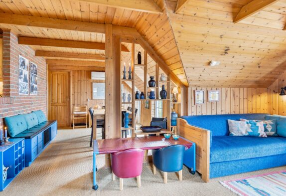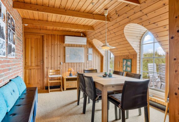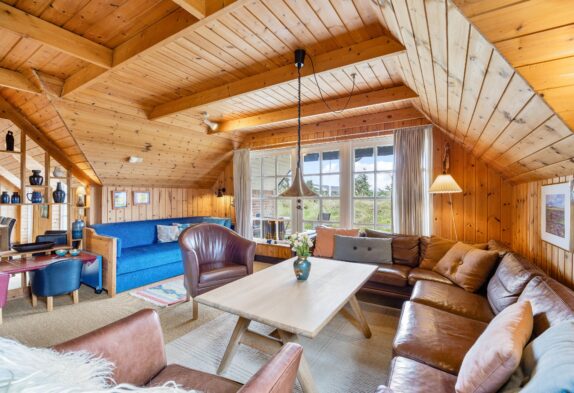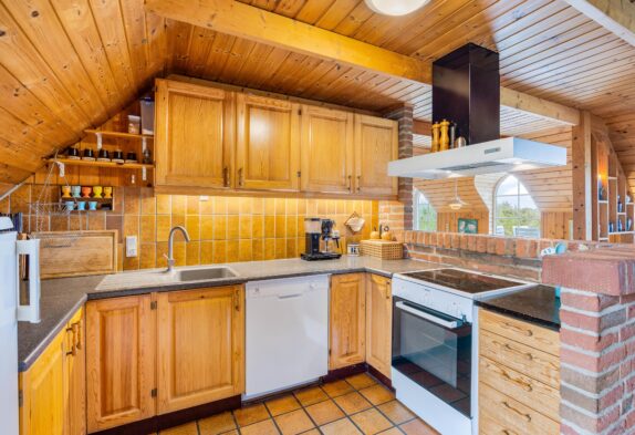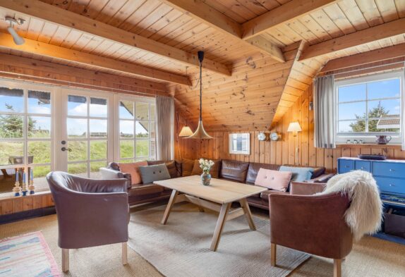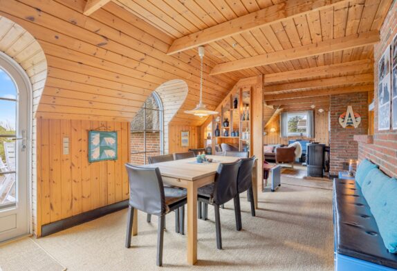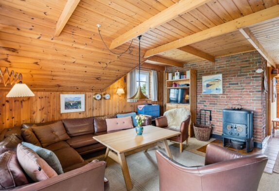 Den rustikke indretning sætter rammerne for en helt enkel og afslappende sommerhusferie langt væk fra den grå hverdag. Den charmerende spise- og opholdsstue er i åben forbindelse med det veludstyrede køkken, og her kan hele familien samles i sofahjørnet til en god film efter aftensmaden, og mens aftenen går på hæld, vil brændeovnens knitrende flammer sprede masser af varme og feriestemning, mens I nyder hinandens selskab.