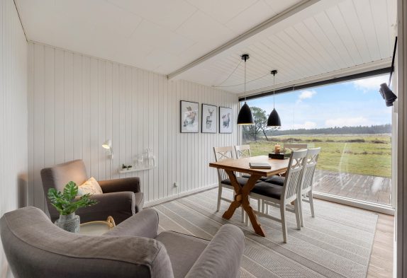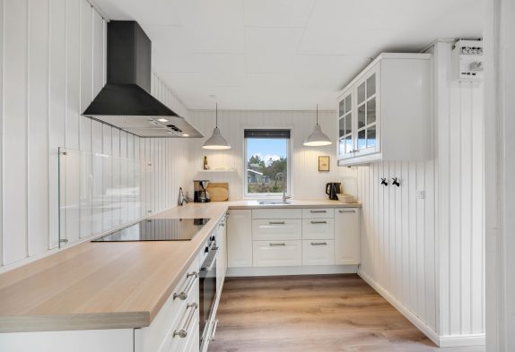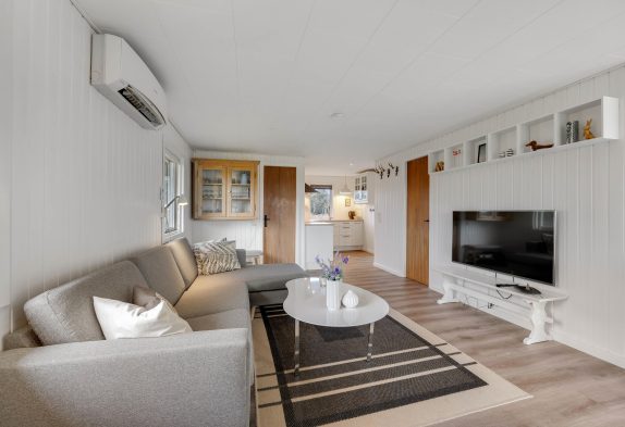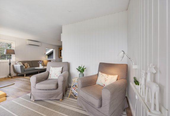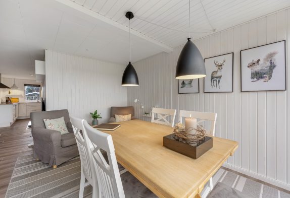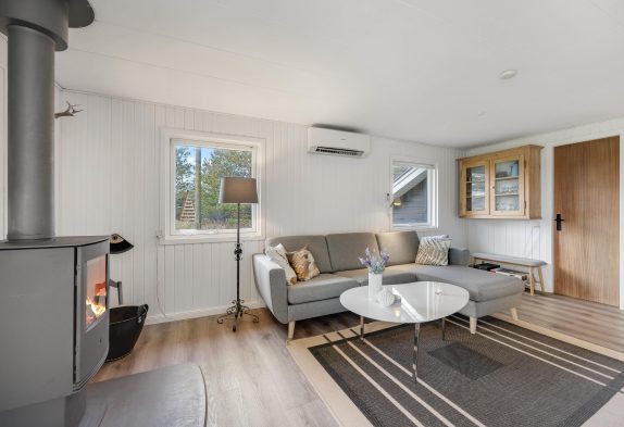 Også indenfor kommer naturen til sin ret. Huset er ældre, men nænsomt renoveret og smukt indrettet med et nyt smart, og særdeles godt udstyret køkken med induktionsplader og moderne ovn. Imens I ordner opvasken, kan I være heldige og se krondyrene spankulere forbi, – de krydser ofte grunden. Gulspurvevej 17 er et rigtigt lyst og venligt hus, et kæmpe vinduesparti åbner op for udsigten, så man føler, at man stadig er midt i naturen. For optimal hygge sørger brændeovn og energibesparende luft-varmepumpe.