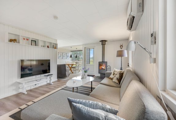 Et hus med udsigt – her er det! I dette charmerende sommerhus, med god plads til 4 personer, bor I rigtigt smukt, lyst og alligevel hyggeligt med bekvem lænestol, sofa, stort fjernsyn, brændeovn og meget mere.