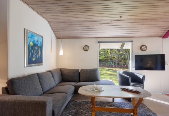 Det er bestemt også tilfældet her, og mens I helt uforstyrret nyder det gode vejr og feriefridagene på terrassen, kan børnene og hunden få lov til at lege sig trætte på den store græsplæne, eller på husets egen lille legeplads med gyngestativ og sandkasse.