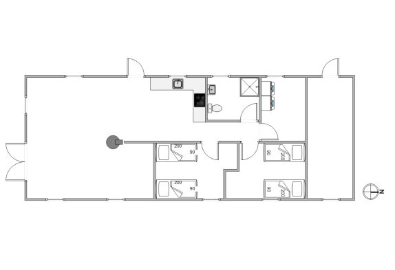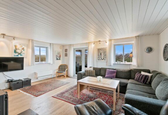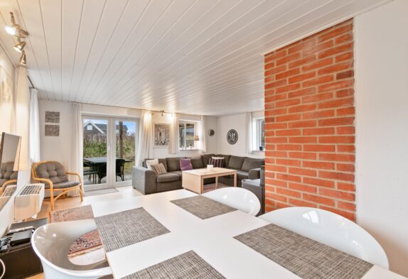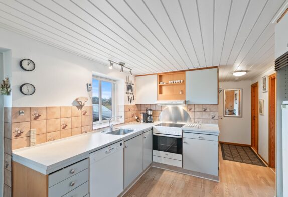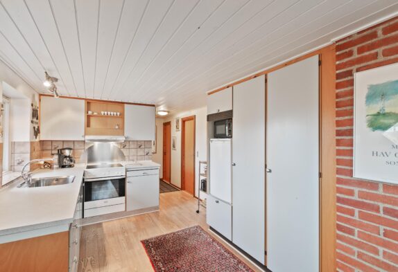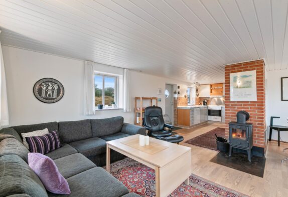 Huset er indrettet til 4 personer, og med et boligareal på 84 m² har I god plads at brede jer ud på. Især i det kombinerede opholdsrum, hvor stue, spiseafdeling og køkken smelter sammen i ét og udgør et hyggeligt mødested. Her kan I få dagene til at gå med afslapning på den dejlige hjørnesofa og sene aftener rundt om spisebordet med et glas rødvin – alt imens brændeovnens knitren høres i baggrunden.