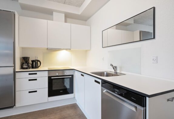 Indretningen er ikke kun moderne, der er også tænkt på det praktiske her. På badeværelset finder I en vaskemaskine, tørretumbler samt opbevaringsplads og gulvvarme, og i køkkenet står opvaskemaskinen klar til at overtage de huslige pligter for jer og give jer en enkel og ukompliceret ferie.