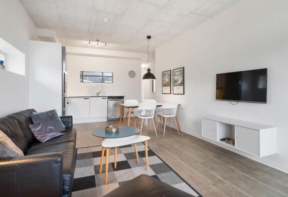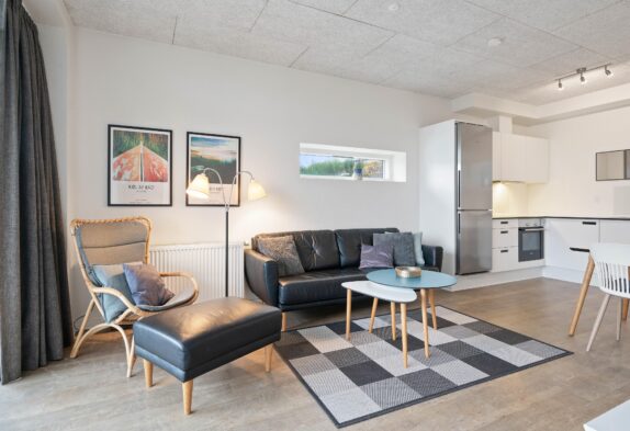 Indvendigt byder feriehjemmet på en stilfuld og lys indretning til 4 personer. Hvide vægge og flotte troltekte lofter skaber en imødekommende atmosfære og de velafstemte møbler fungerer som rød tråd i hele lejligheden.