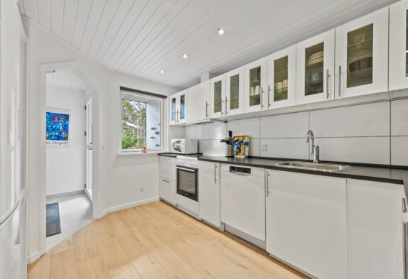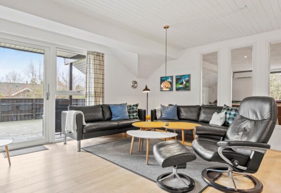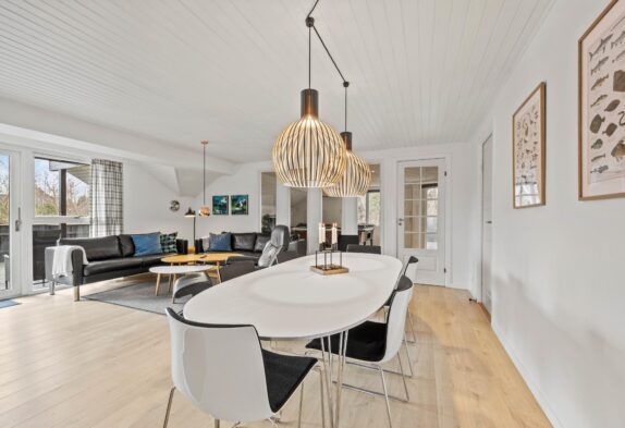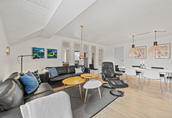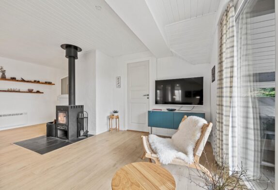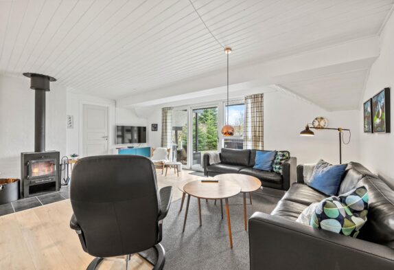 Dette 150 m2 store sommerhus er indrettet med 4 gode soverum og 2 badeværelser. Det store køkken er lyst og veludstyret. I stuen er der rigelig plads til hygge med spil, en god bog eller en god film, brændeovnen sørger for en ekstra hyggefaktor.