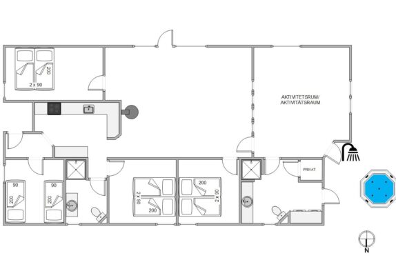 Aktivitetsrummet med både pollbillard, bordtennis, bordfodbold og dart skaber rammerne for mange timers underholdning for såvel unge som voksne samt for hyggelige familiedyster.
