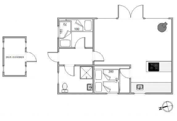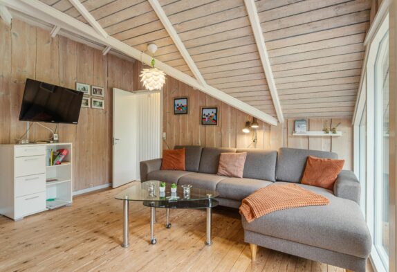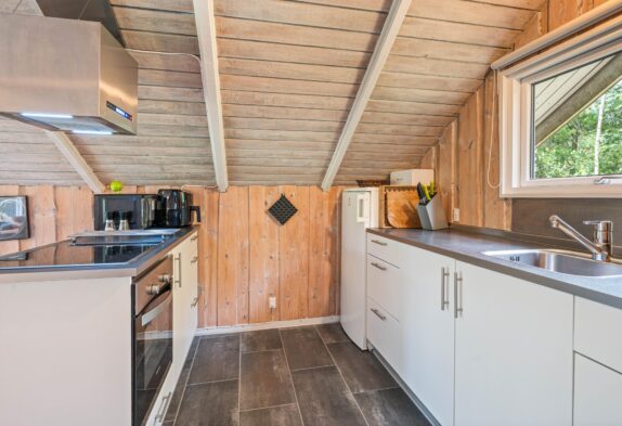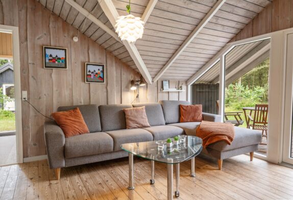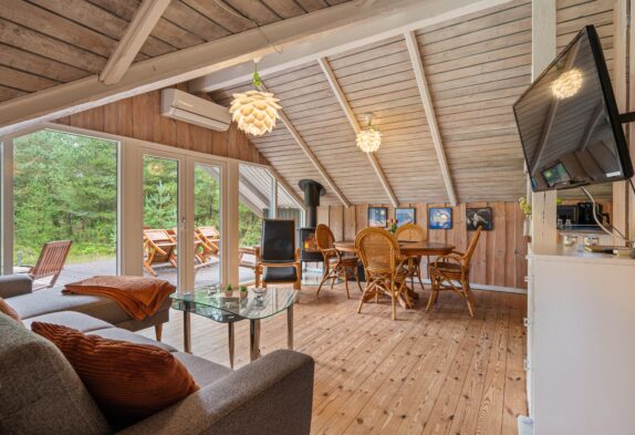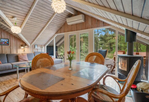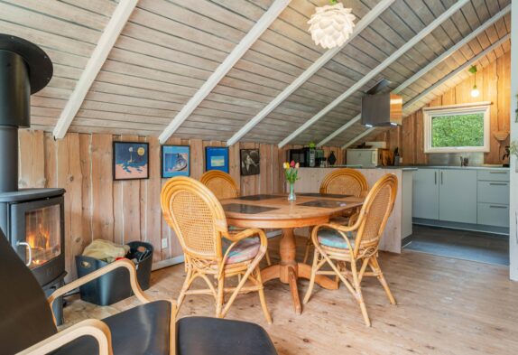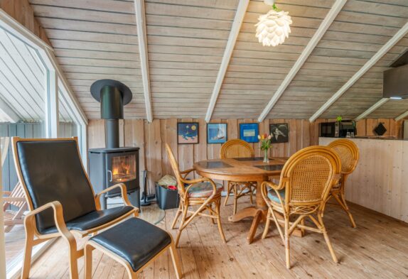 Den klassiske sommerhuscharme med mange skråvægge bliver fuldendt af brændeovnen, som med sine knitrende flammer vil sprede varme og god feriestemning hele året rundt – på regnfulde dage med varm kakao, og på sene forårsaftener, mens mørket falder på, og I nyder et sidste glas rødvin inden sengetid.