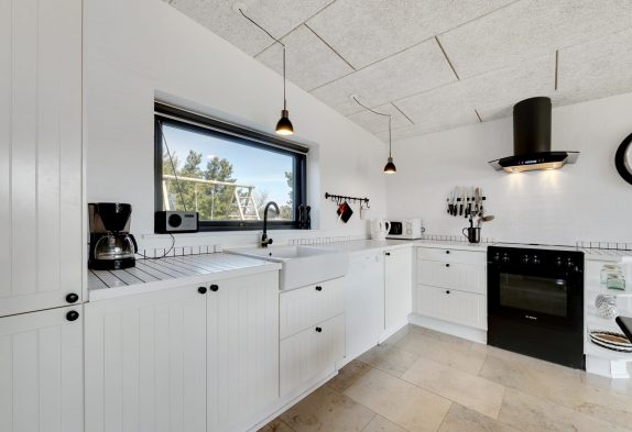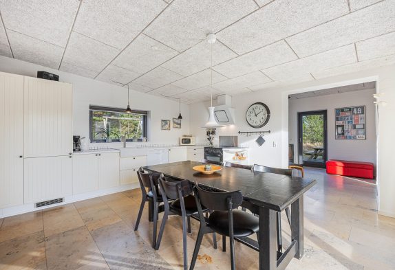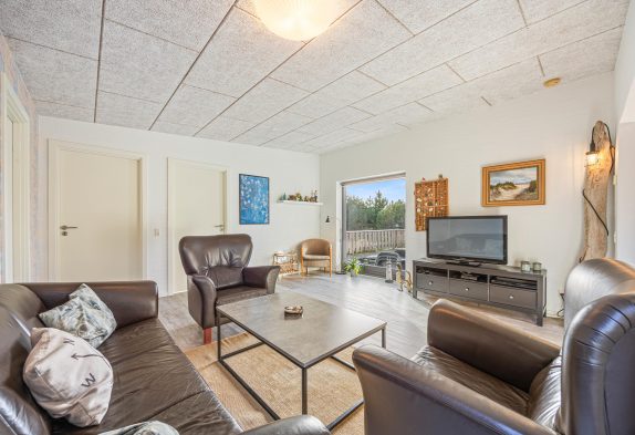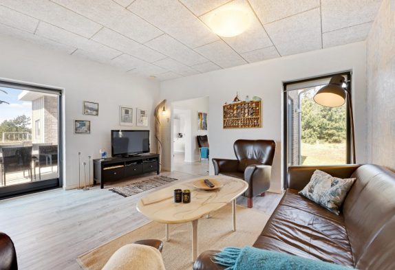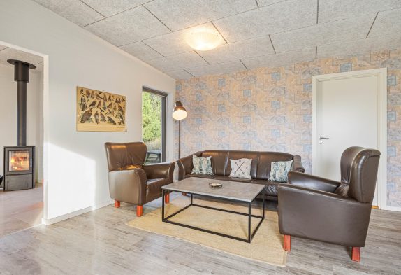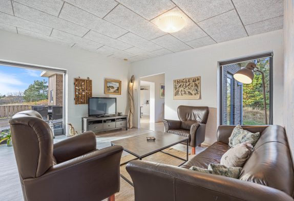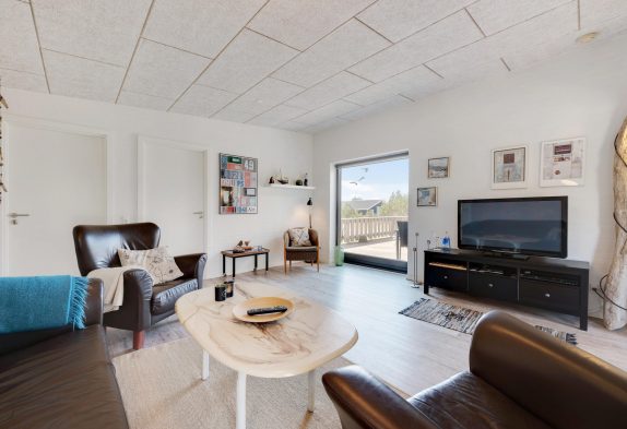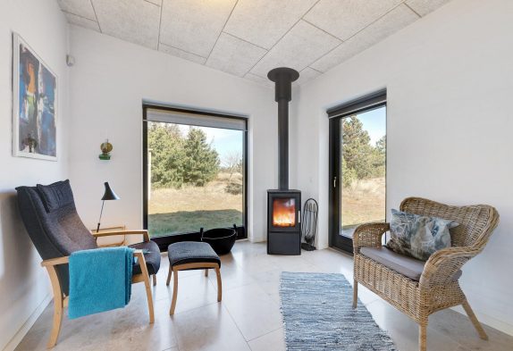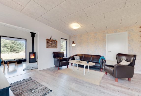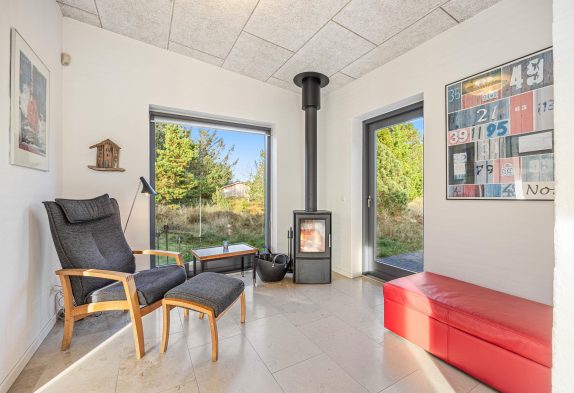 Dette lækre feriehus er udstyret med en elbesparende varmepumpe og er bygget som lavenergi-hus. Fra det moderne og veludstyrede køkken med god spiseafdeling har I overblikket over sommerhuset samt en fin udsigt over området. De store og smagfuldt møblerede stuer giver en fantastisk fornemmelse af rummelighed med de lyse vægge og det fascinerende lysindfald fra de store vinduespartier. Det lyse loft, som går helt til kip, er beklædt med lyddæmpende materiale, hvilket understreger det behagelige indemiljø i dette fine feriehus.