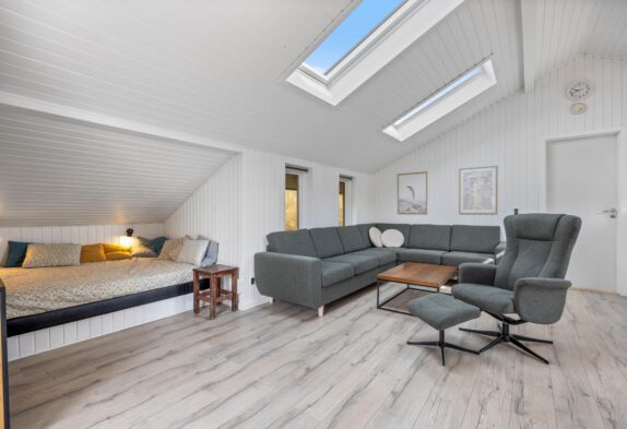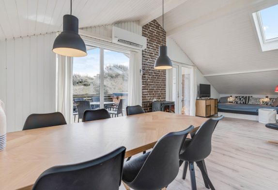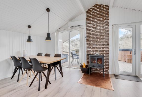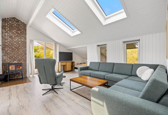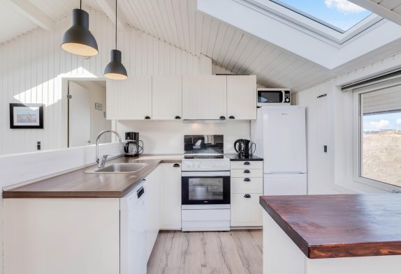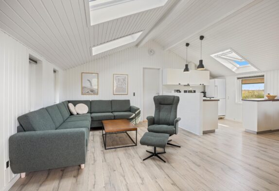 Det åbne køkken danner sammen med spiseafdeling og en god komfortabel opholdsafdeling centrum i dette sommerhus. Lystfiskere vil blive glade for den separate fryser på 100 liter. De hvidmalede trævægge og loft til kip giver en god fornemmelse af rummelighed, og den moderne, smagfulde møblering øger nydelsen af den afslappende ferie. Brændeovnen spreder varme og hygge til både spisepladser og sofagruppe. Her er en mindre alkove, som indbyder til en afstressende stund for både voksne og børn.