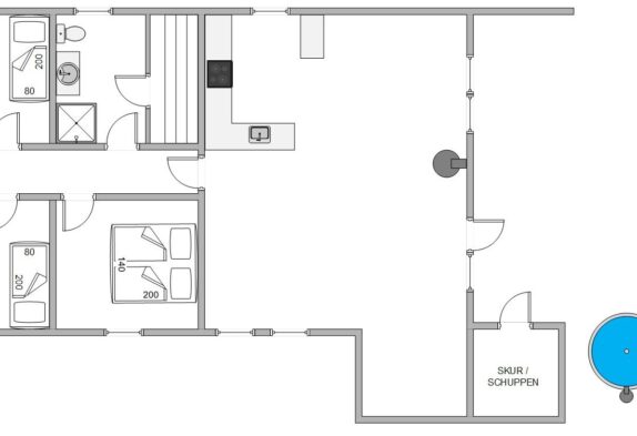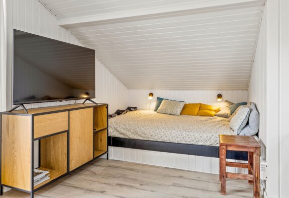 Tre gode soveværelser giver plads til 6 personer. Fra feriehusets badeværelse med bruseniche og gulvvarme er der adgang til sauna. Sommerhuset opvarmes blandt andet med en energibesparende varmepumpe.