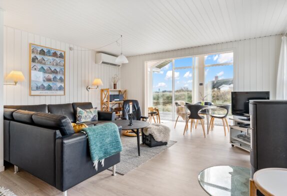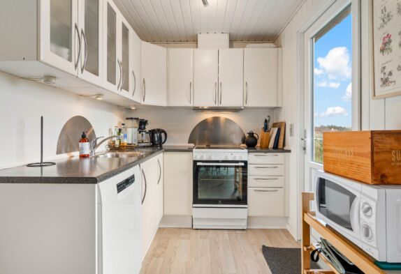 De store vinduespartier slipper masser af lys ind, og sammen med de hvidmalede vægge og lofter sørger de for en behagelig og afslappende ferieatmosfære. Stue, spiseafdeling og køkken er kombineret i ét hyggeligt opholdsrum, hvor hele familien kan samles om madlavningen og slappe af på sofaen med en god film.