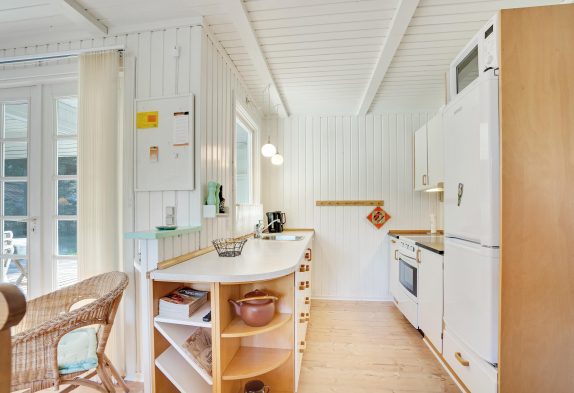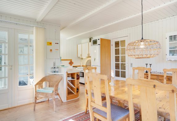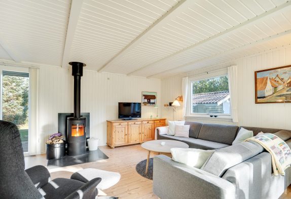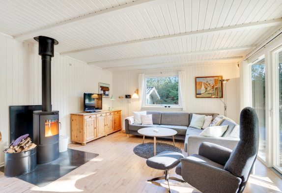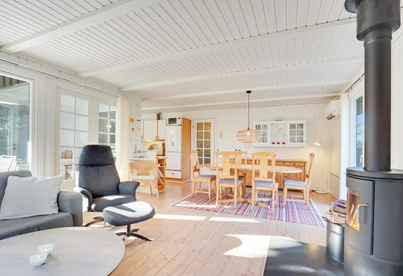 I sommerhuset har du et veludstyret køkken, hvorfra der er åben forbindelse til den store stue, hvor du både har spise- og opholdsafdeling. Her kan du tænde op i brændeovnen og underholde dig selv og familien med en god film eller sjove spil.