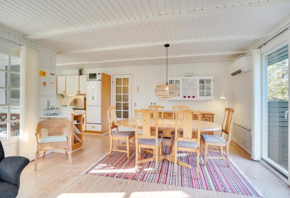 Sommerhuset har desuden en energibesparende varmepumpe, der hjælper med at holde varmeomkostningerne nede. Og i både køkkenet og stuen har du flotte og rengøringsvenlige trælaminatgulve.