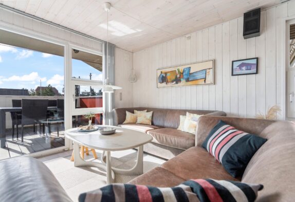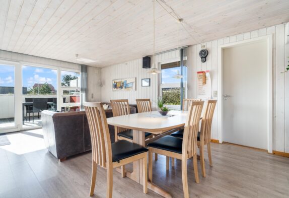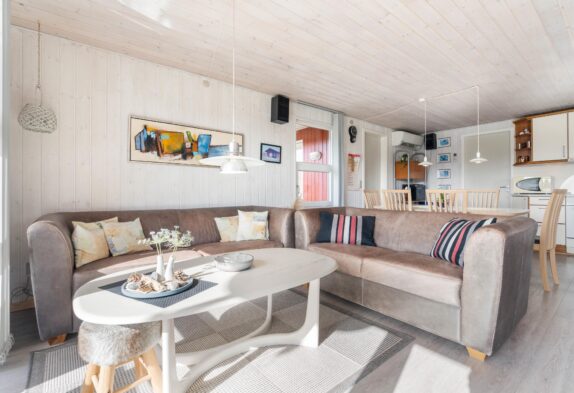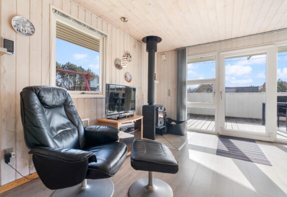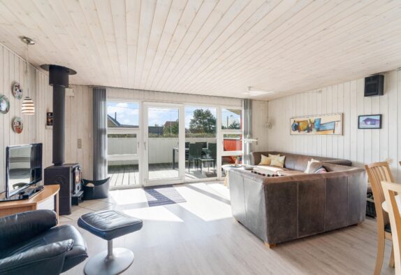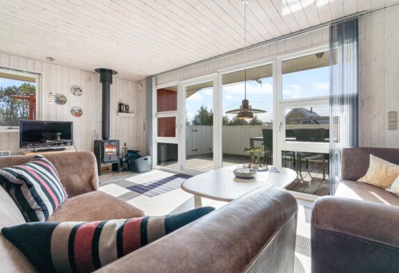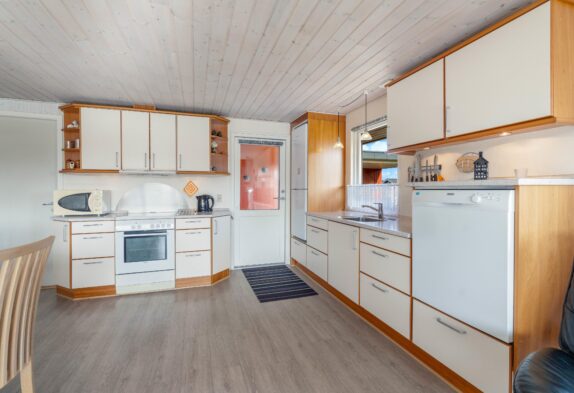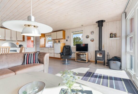 I dette rummelige feriehus er stue, spiseafdeling og køkken samlet i et stort rum. Køkkenet er veludstyret med bl.a. opvaskemaskine, mikroovn og fryser (40L). I den hyggelige opholdsstue er der et fint lysindfald, som giver hele feriehuset en meget indbydende atmosfære. Her er bl.a. TV/parabol, brændeovn og radio – og det trådløse internet kan benyttes gratis.