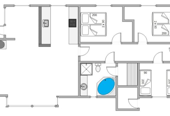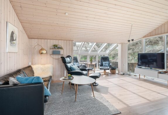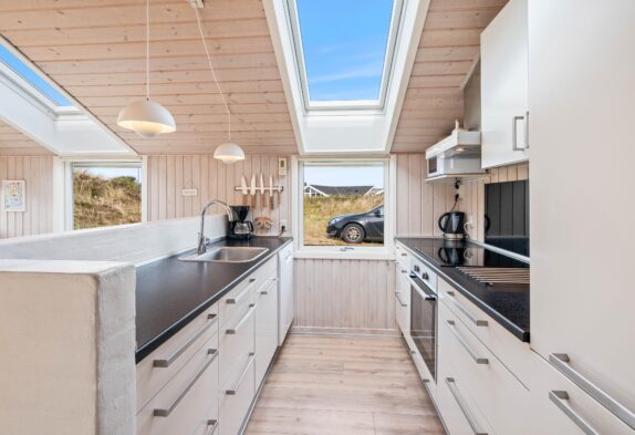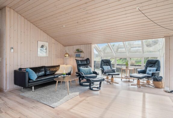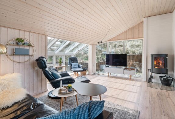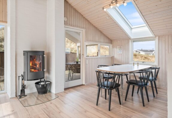 Sommerhuset ligger kun 250 m fra stranden og Vesterhavet og blot 1100 m til nærmeste indkøbsmuligheder ved den lokale Købmand i Bjerregård. Der er 3 gode soveværelser, 2 af værelserne har en dobbeltseng og det sidste har 2 enkeltsenge. I badeværelset er der hjørnespa, sauna, vaskemaskine, bruseniche samt gulvvarme. I køkkenet finder I oså en opvaskemaskine, mikroovn og en fryser på 70 liter. Stuen er både hyggelig, smagfuldt indrettet og udstyret som man forventer i et moderne sommerhus. Der er en god brændeovn, et fladskærms-TV, DVD, bluetooth højtaler og en energibesparende varmepumpe, som desuden kan benyttes som Aircondition på varme dage. Sidst men ikke mindst byder dette sommerhus også på en tørretumbler. I stuen kan I samles til filmaften og nyde varmen fra brændeovnens knitrende flammer i baggrunden. Samtidig gør det store køkkenalrum det muligt at samles alle sammen, mens nogle kan stå for madlavningen og andre kan spille brætspil ved spisebordet.