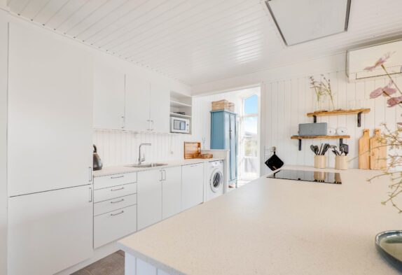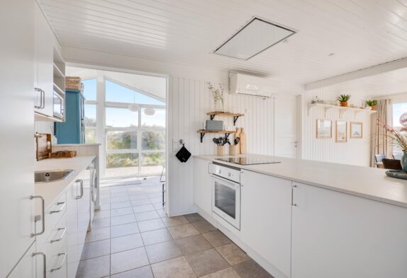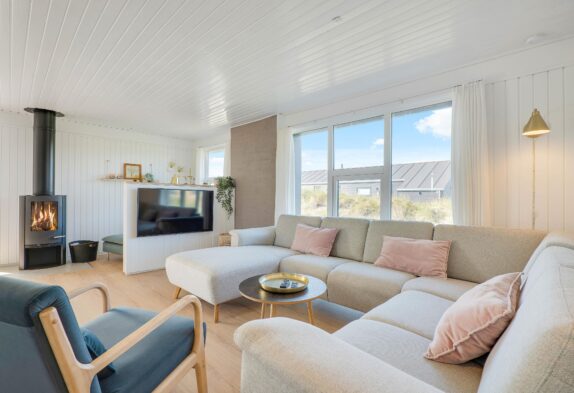 Fra entréen går man direkte ind i det veludstyrede køkken, der blandt andet er udstyret med et helt nye hårde hvidevarer. I skuret finder I desuden en ekstra 100 L fryser. Fra køkkenet kommer I videre til det flotte alrum, hvor brændeovnen spreder varme og hygge. Der er både smart TV, Chromecast og en musikafspiller med bluetooth, så I har masser af underholdningsmuligheder på ferien.