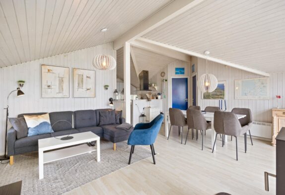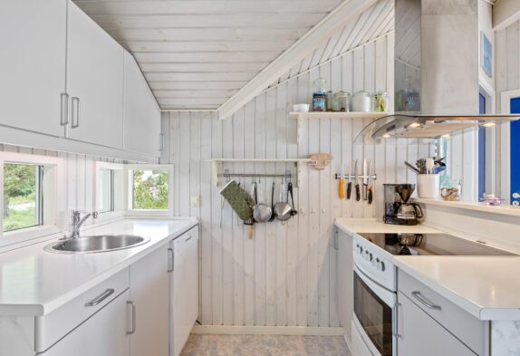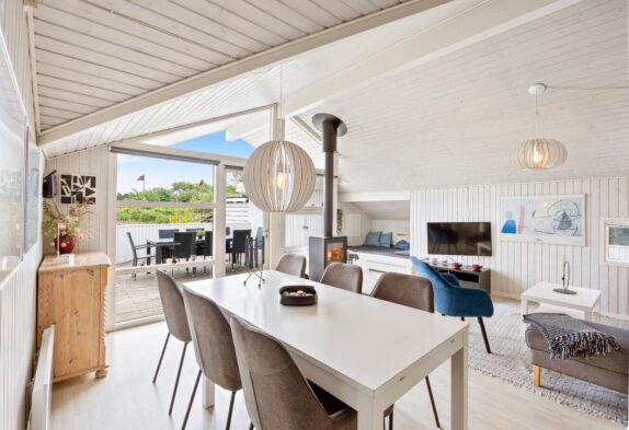 Indvendigt præsenterer sommerhuset sig også dejlig lyst. Feriehusets hjerte er den fine spisestue med integreret køkken, hvor I sammen kan slappe af, lave mad og spise.