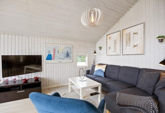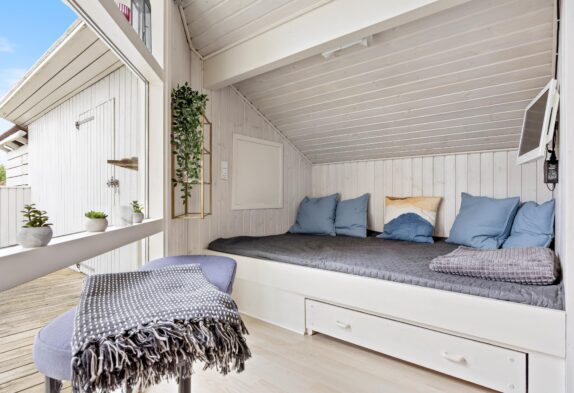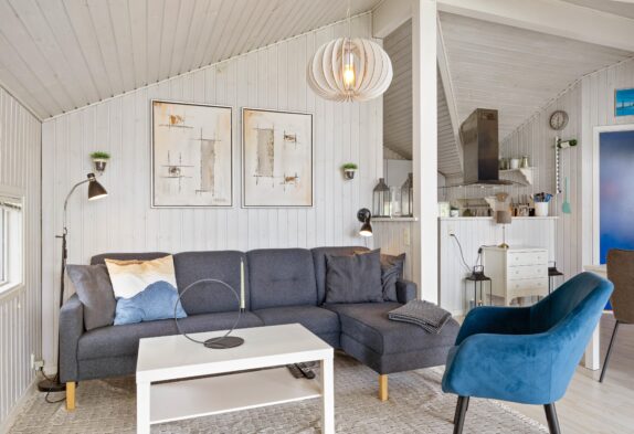 Strålende hvidt byder det L-formede sommerhus jer velkommen i Bjerregård Nord. Her kan I holde en hyggelig ferie med op til 6 personer + 1 hund på knap 80 m², og med en ekstra bonus oveni: spabad.