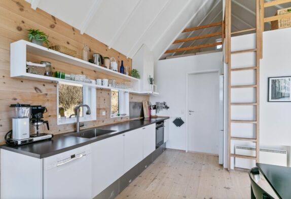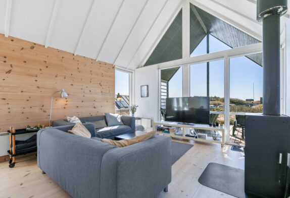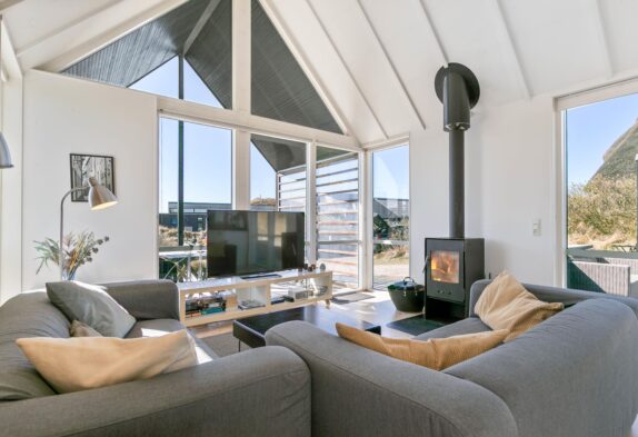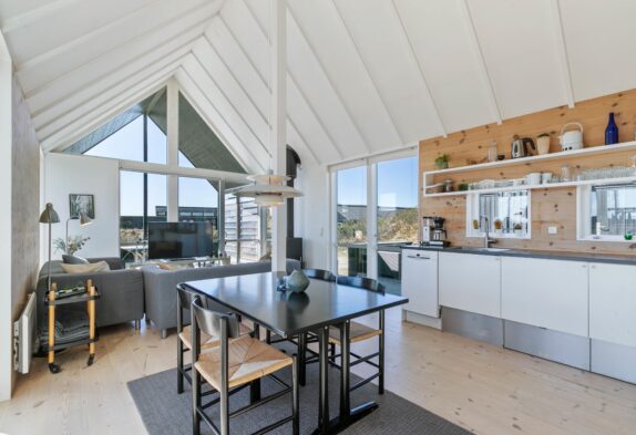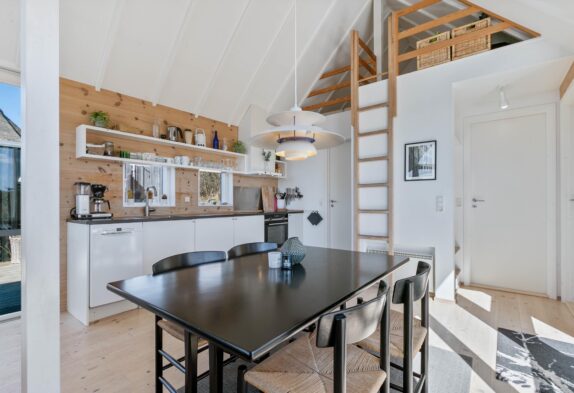 Et moderne velindrettet køkken og en spiseplads med udsigt indbyder til i fællesskab at tilberede lidt godt til ganen. Efter maden kan I tænde op i brændeovnen og sætte jer til rette i den grønne sofa foran fjernsynet.