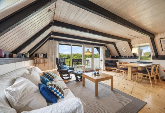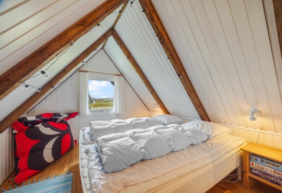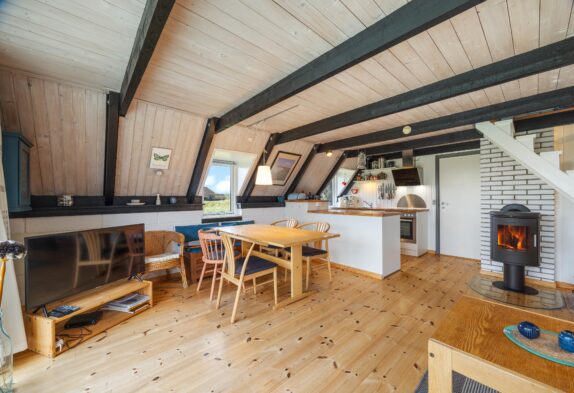 Her kan I holde ferie i et rigtig hyggeligt og indbydende sommerhus med alt, hvad man behøver på den vellykkede ferie. I den lyse stue med komfortabel opholdsafdeling spreder den gedigne brændeovn den ægte sommerhushygge og de 2 fine soveværelser på 1.sal har fine senge til 4 personer.På det ene værelse fnder I en dobbeltseng, mens det andet værelse er indrettet med 2 komfortable enkeltsenge.