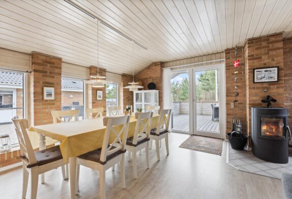 På sommerhusets store afskærmede terrasse som former en gårdhave kan I sidde i læ og nyde en dejlig kop kaffe eller nyde aftensmaden selvlavet på feriehusets egen grill. Her kan hunde frit løbe rundt, da terrassen er lukket. I garagen kan I finde et aktivitetsrum med bordfodbold, bordtennisbord, dart og mere til alle aldre.