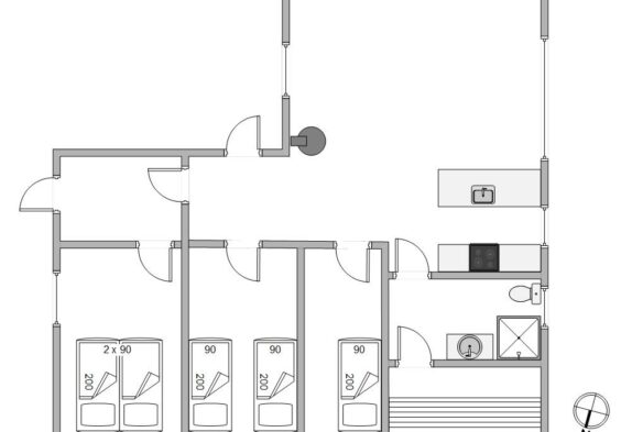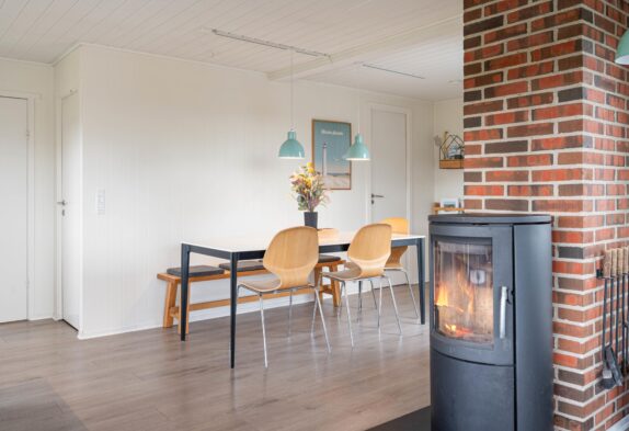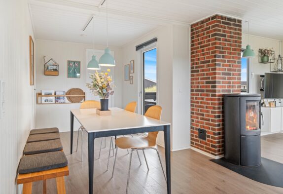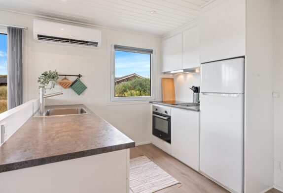 Sommerhuset på Bjerregårdsvej 365 er lyst og venligt indrettet, og feriestemningen toppes med brændeovn og sauna til de kølige dage. Den åbne planløsning giver plads til et praktisk køkken i forbindelse med en dejlig lys spiseplads og opholdsstue med sofagruppe og brændeovn. Her kan I se en film sammen eller trække jer tilbage med en god bog. I køkkenet er alt, hvad I behøver for at forkæle hinanden med lækre hjemmelavede måltider.