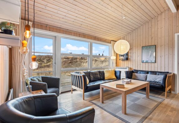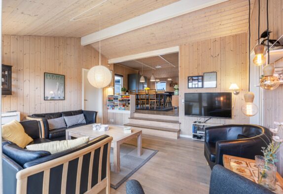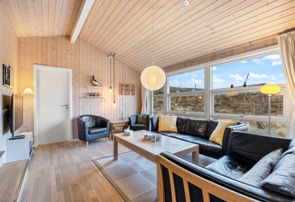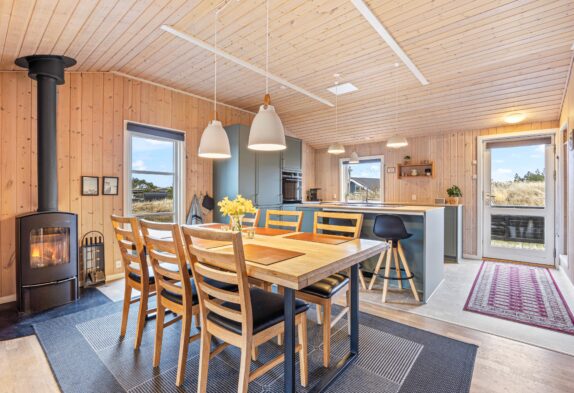 Her kan I holde ferie i et særdeles velplejet feriehus med gode lyse rum, et funktionelt køkken i åben forbindelse med spiseafdelingen. Her er den hyggelige brændeovn placeret, og desuden er der en nedsænket opholdsafdeling, hvor fladskærms-TV, DVD, stereoanlæg sikrer en afslappet stemning på ferien. Feriehuset har også en energibesparende varmepumpe, som I med fordel kan benytte jer af.