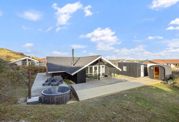 På den delvist overdækkede terrasse kan I nyde aftenen med en hyggelig grillaften i fællesskab. Bagefter inviterer vildmarksbadet i haven sammen med udendørssaunaen jer til at slappe af under den stjerneklare himmel, mens I lytter til havets rolige brusen bag klitterne.