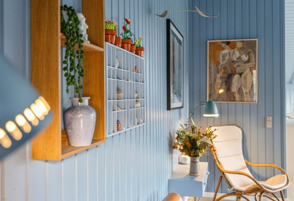 Feriehuset er velholdt og har loft til kip med ovenlysvinduer, hvilket gør det lyst og indbydende. Indretningen er charmerende med en gennemgående lyseblå farve i sommerhuset. Med 3 soveværelser er der plads til 6 personer, hvoraf 2 af værelserne er indrettet med dobbeltseng. På det sidste værelse finder du en køjeseng – perfekt til børnene.
