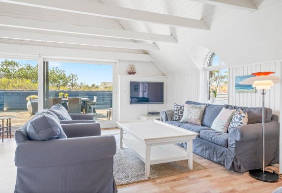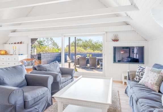 Sommerhuset har en skøn og lukket terrasse, som er placeret mod syd og mod vest. Mod syd er den endvidere delvist overdækket, hvilket er helt ideel til grillaftener. Både børnene og familiens hund vil nyde den lukkede terrasse, især fordi den er så dejlig stor. Der er desuden en sandkasse på naturgrunden udenfor terrassen, hvor børnene kan øve sig på at konstruere sandslotte, inden turen går ned til Vesterhavet, som ligger kun 750 meter fra sommerhuset.