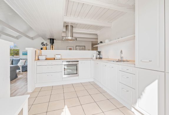 I køkkenet er der f.eks. en fryser på 60 liter og en opvaskemaskine. Sommerhuset byder desuden på vaskemaskine og en tørretumbler, så I kan spare lidt plads i kufferten, og den energibesparende varmepumpe sørger for en behagelig varme samt en mindre forbrugsregning ved afrejse – med andre ord; flere lommepenge til alt det sjove i ferien. Varmepumpen kan på varme dage også bruges som aircondition.