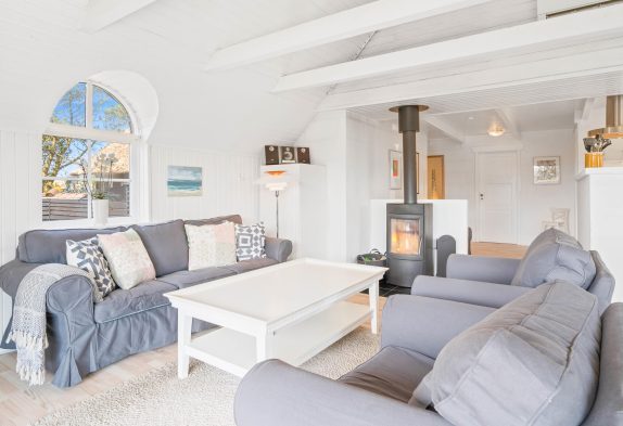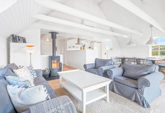 I sommerhuset her på Julianevej 12 kan I holde ferie i et sommerhus til 8 personer og 1 hund. Sommerhuset er indrettet med brændeovn, der giver dejlig varme i alrummet. Fra stuen er der udgang til en stor, lukket og delvist overdækket terrasse, som er perfekt, hvis I har små børn eller hund.