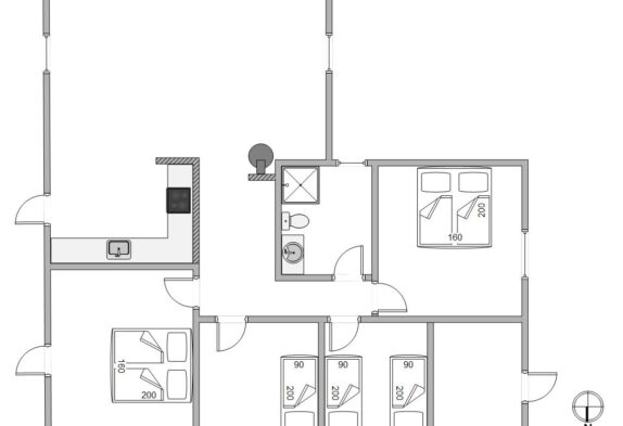 Sommerhusets sovepladser er fordelt på 4 værelser, hvoraf 2 er indrettet med dobbeltsenge på 160 cm. Et andet værelse er indrettet med 2 køjesenge, mens I på det sidste værelse finder én køjeseng.