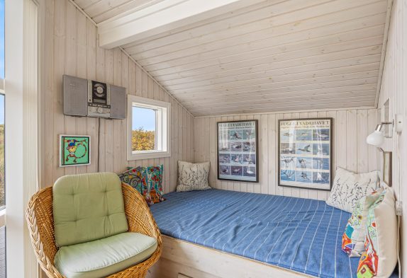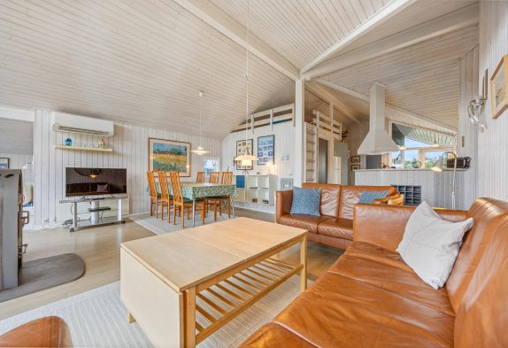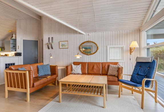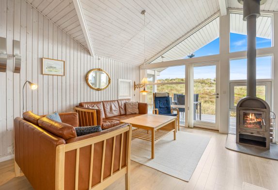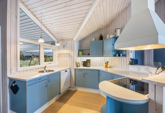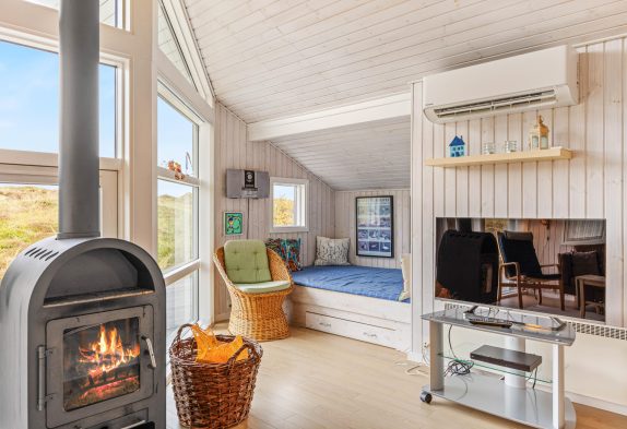 I køkken og stue er der træloft til kip, køkkenet er udstyret med en opvaskemaskine, en mikroovn og en fryser på 10 L. Stuen er hyggeligt indrettet, og her er der også trægulv samt en smuk udsigt over klitlandskabet mod vest. Der er en brændeovn, et fladskærms-TV, en radio m/CD-afspiller, varmepumpe og gratis trådløst internet.