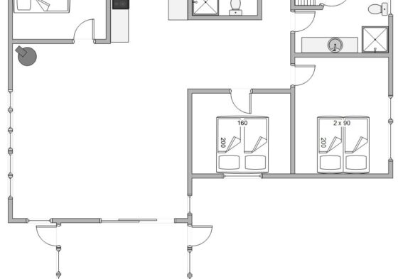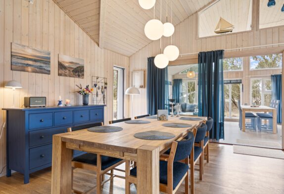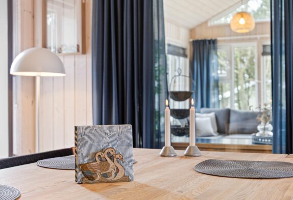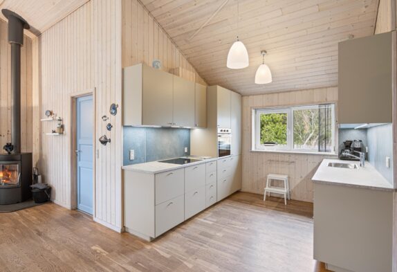 De 112 m2 er praktisk fordelt: Det åbne køkken-alrum med stue, moderne køkken samt adgang til udestuen, bliver utvivlsomt samlingspunktet. Her er der plads til fælles madlavning, filmaftener i sofaen, sjove spil og planlægning af feriens udflugter i den unikke natur – lokalt som regionalt. Den isolerede udestue tillader tilbagetrækning og afslapning med lys og udsigt til natur og himmel.
