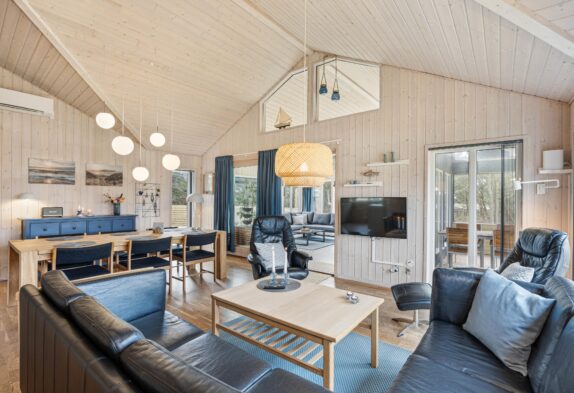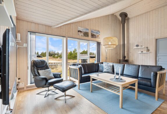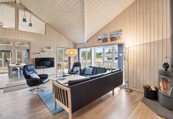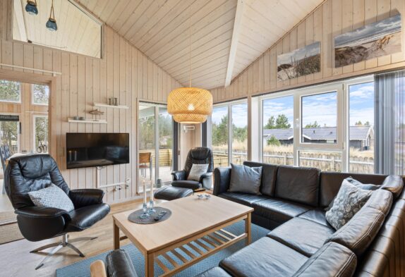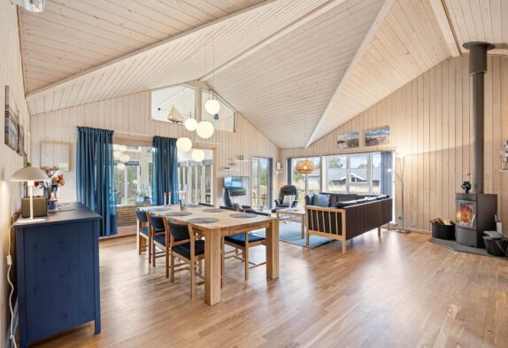 På Bjerregårdsvej 21 venter jer et dejligt sommerhus med plads til 6 gæster. Tag også gerne hundene med – De er velkomne her. Sommerhuset er hyggeligt indrettet med lyse trævægge, komfortable møbler og med højt til loftet, hvilket, sammen med de store vinduer, skaber en luftig fornemmelse og lukker det helt specielle lys ind. En varmepumpe sørger for et behageligt indeklima sammen med den hyggelige brændeovn.