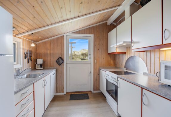På det store badeværelse er der både spabad og sauna. Det er helt sikkert noget børnene vil nyde. Men mor og far kan sikkert også hurtigt blive fristet til en afslappet stund her. Desuden er der både vaskemaskine og tørretumbler i sommerhuset, så I har mulighed for at have rene håndklæder efter en tur i spabad og sauna.