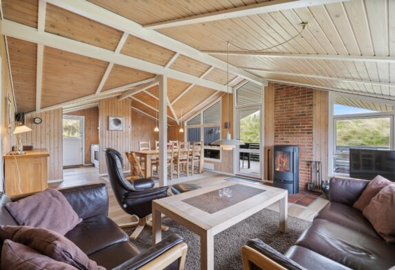 Stuen og spiseafdelingen er hyggeligt indrettet i samme rum med brændeovn, så familien ikke behøver at sidde adskilt over forskellige aktiviteter. Og der er åbent ud til køkkenet, så du stadig kan være med i samtalen og hyggen, selvom du laver maden.