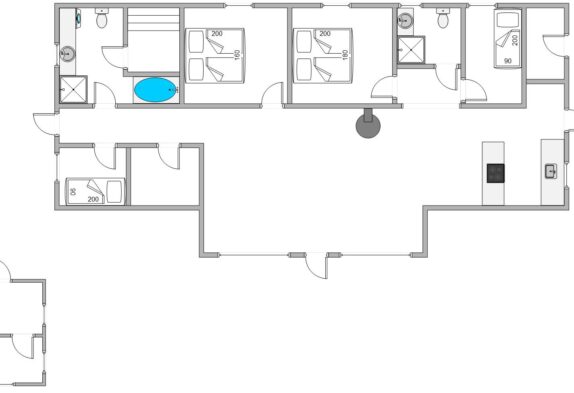 Der er to badeværelser, begge med gulvvarme og bruseniche. Det store badeværelse har endvidere en spa, en sauna og en combi vaskemaskine/tørretumbler. I køkkenet er der en fryser på 40 liter, en opvaskemaskine og en mikroovn.