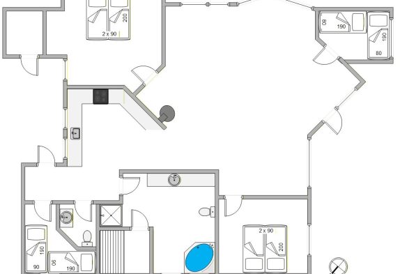 Feriehuset er med fire soverum og to badeværelser så praktisk indrettet, at der er plads nok til otte personer. I 2 af værelserne er der dobbeltsenge (180x200cm). I de sidste 2 værelser er der 2 enkeltsenge i hver. Bemærk her, at de måler 90x190cm. Og da der også må medbringes op til to hunde, har I her de bedste rammer, hvor hele familien kan samles.