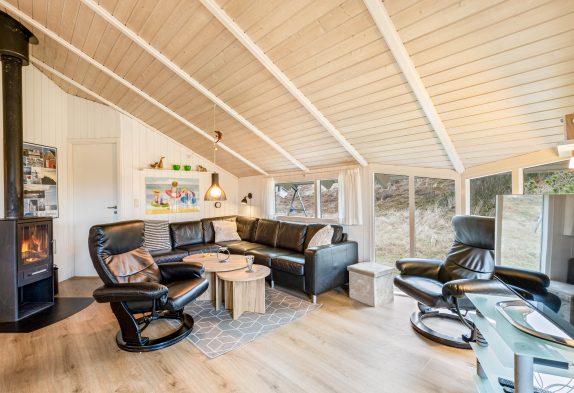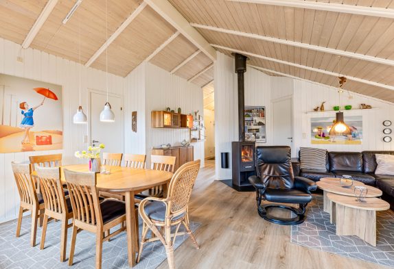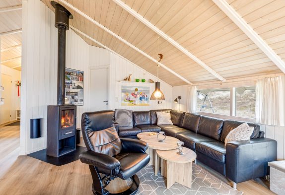 Der er også et dejligt åbent køkken og en stor opholdsstue med brændeovn. Så her kan I bruge pladsen og nyde hinandens nærvær, mens der kræses lidt ekstra om madlavningen og hygges i sofaen.