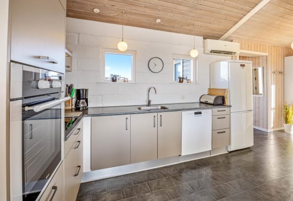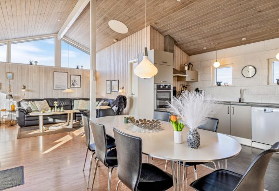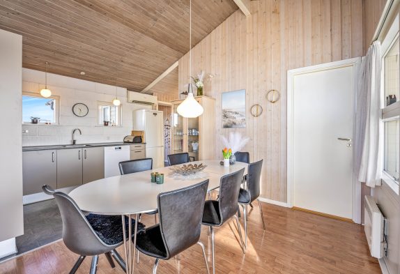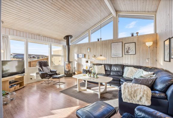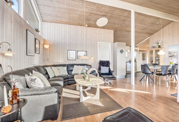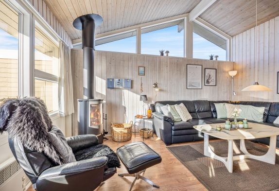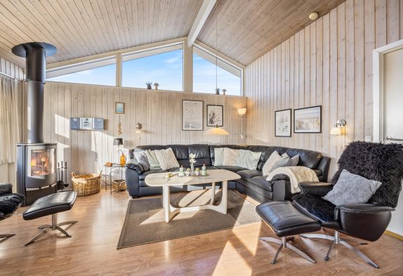 I dette feriehus er der ikke sparet på udstyret og indretningen, så her får I både et veludstyret køkken, stue med brændeovn og varmpepumpe, to badeværelser med gulvvarme samt sauna og spa – de ideelle forhold til en dejlig ferie. Og på den store naturgrund er der gynger og sandkasse til børnene samt en stor lukket terrasse.