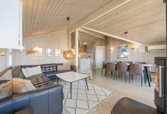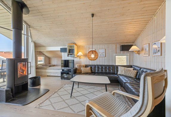 I stuen er der lagt op til afslapning; her kan I for alvor flyde ud i den store hjørnesofa, imens pejsen knitrer i baggrunden. Stuen, hvor der er højt loft, er i åben forbindelse med køkkenet, hvilket skaber en rummelig fornemmelse. Her er plads til at være sammen, mens I har gang i forskellige ting. Ved spisebordet hænger desuden en energibesparende varmepumpe, der sørger for et behageligt indeklima.