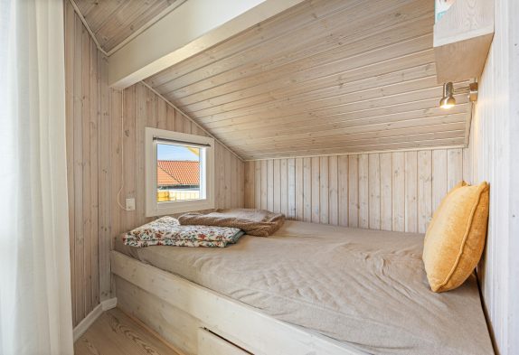 Sommerhuset er beliggende i Bjerregård, tæt på stranden og Vesterhavet. Her kan familien nyde en afslappende ferie væk fra hverdagens stress og jag – her er plads til 8 gæster og deres 2 hunde. Her er 3 soverum, hvoraf 2 er indrettet med dobbeltseng og det sidste med 2 enkeltsenge. De sidste 2 sovepladser findes i stuen i form af en hyggelige alkove. Her vil børnene helt sikkert elske at sove i deres egen lille hule.