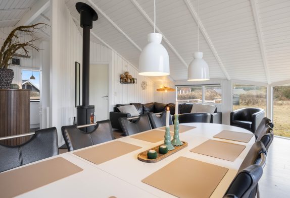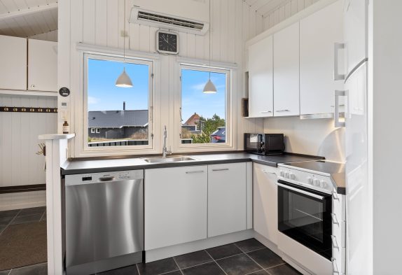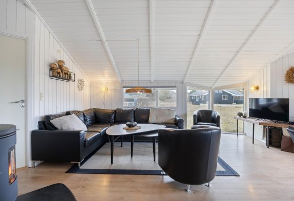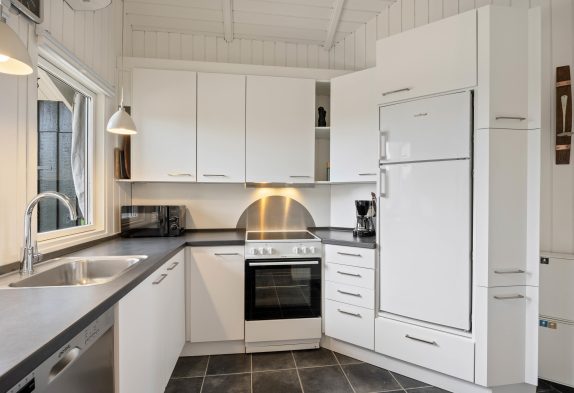 I køkkenet er der laminatgulv, opvaskemaskine, mikroovn og køleskab med frostboks. I stuen er der også trægulv samt træloft til kip, en charmerende brændeovn, et fladskærms-TV og Chromecast.