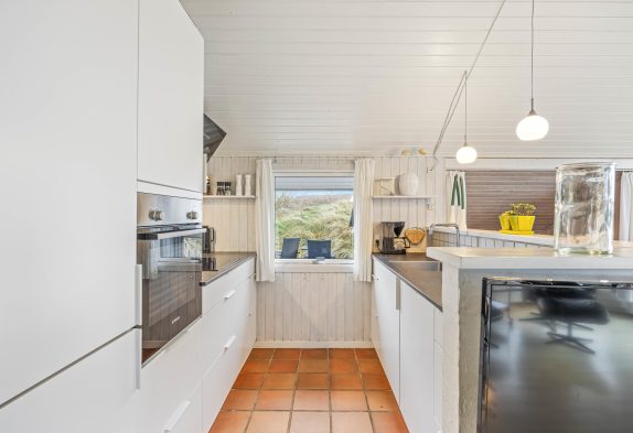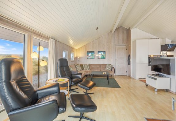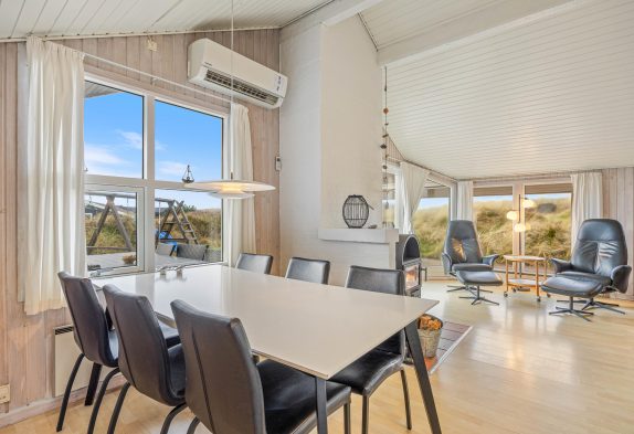 Uanset årstid, vind og vejr så indbyder dette feriehus altid til en afslappende ferie med lange gåture på stranden. Og om sommeren er den store terrasse perfekt til afslappende stunder og hyggelige grillaftener, mens I om vinteren kan hygge Jer med sauna, spabad og den lune brændeovn. Sommerhuset har desuden et ladestik til elbiler.