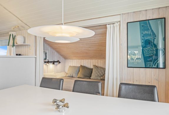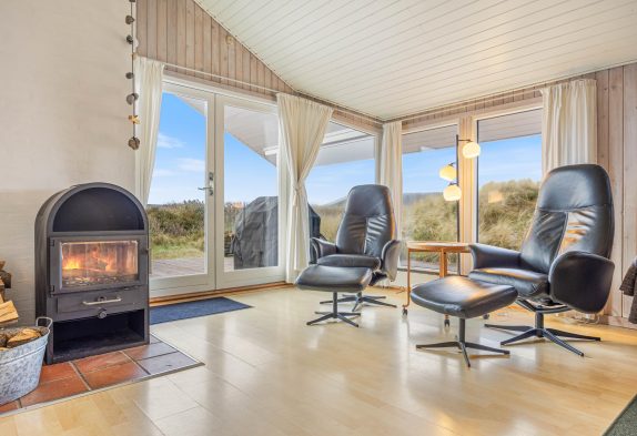 I det hyggelige feriehus har I stue, køkken og spiseafdeling i et stor rum, så der er rig mulighed for at tilbringe masser af tid sammen under ferien. Og ved spiseafdelingen er der endda indrettet en rigtig hyggekrog i form af en alkove, hvor I kan ligge og læse en god bog eller surfe lidt på internettet. Centralt i rummet står den flotte brændeovn, der sørger for en hyggelig stemning og en god varme.