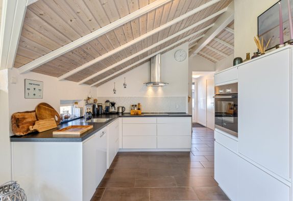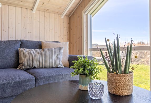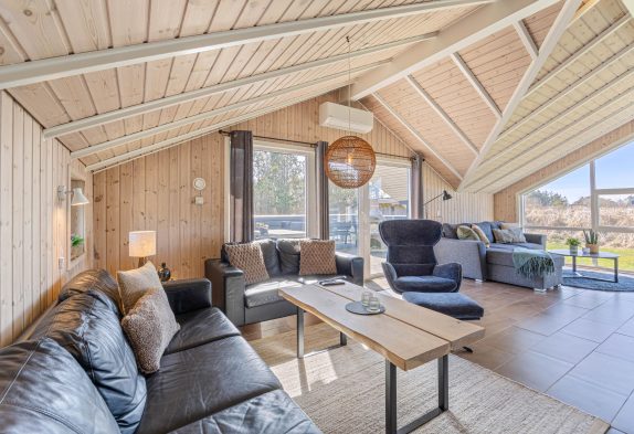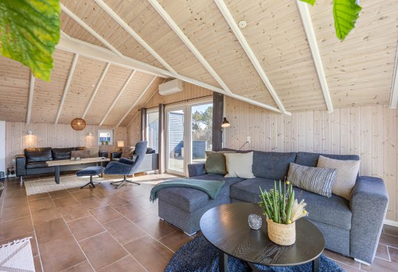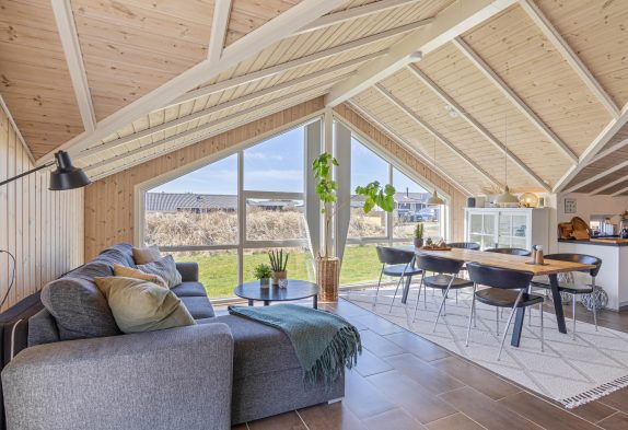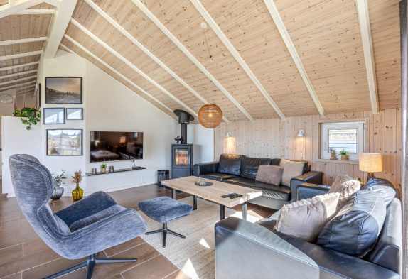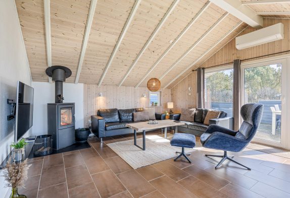 I dette feriehus til 5 personer og 2 hunde kan I nyde en afslappende ferie. Køkken og stue er et stort og dejligt rum, hvor alle er sammen, også under madlavningen. Brændeovnen skaber både varme og hygge, mens I spiser eller spiller kort med børnene. Som et ektra plus er der en energibesparende varmepumpe. De store vinduespartier giver et skønt lys i stuen og virker godt sammen med loftet til kip. Der er naturligvis gratis internet i huset, og der er desuden Chromecast, så I kan holde en hyggelig filmaften.
