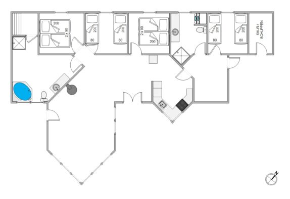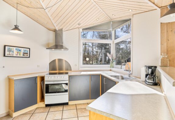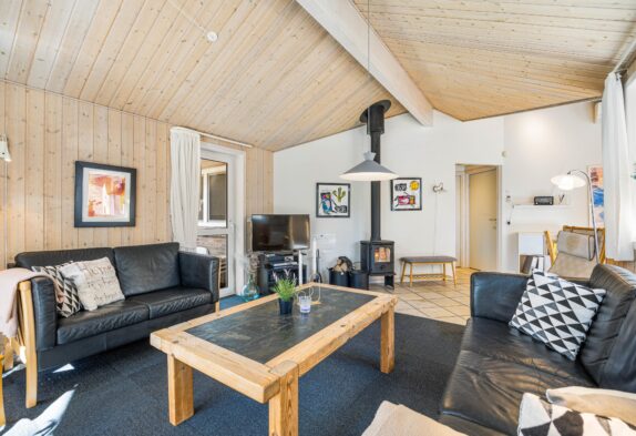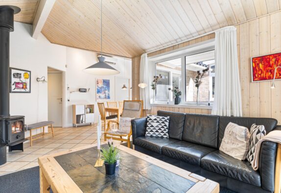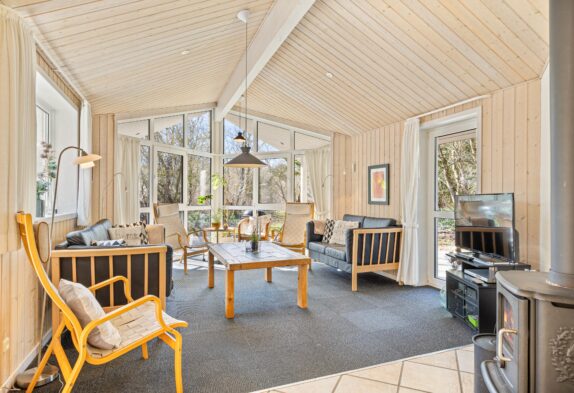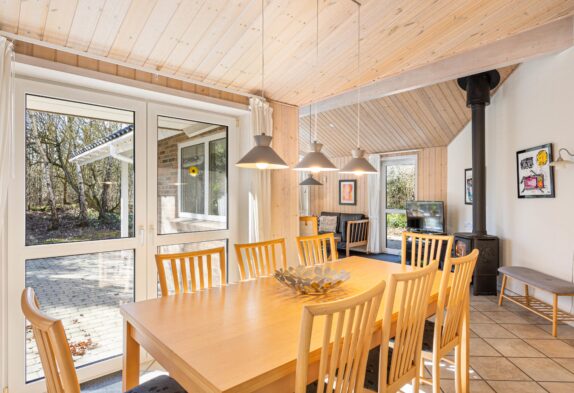 Stue og køkken ligger i åben forbindelse med hinanden, og de store vinduer inviterer ikke kun solens lys, men også den grønne natur indenfor. Brændeovnens knitren gør de mørke efterårsaftener og frostklare vinterdage på sofaen endnu hyggeligere, og rundt om spisebordet kan I samles til mange gode måltider og skønne familiestunder. Sommerhuset er også perfekt egnet til vinterudlejninger, idet det er et godt isoleret stenhus.