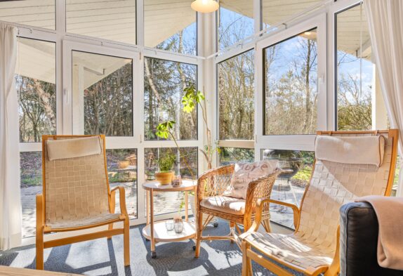 Fra stuen er der udgang til den store, åbne terrasse, som er omgivet af grøn natur og træer, der giver jer både læ, privatliv og ikke mindst en god udsigt fra liggestolene. Mens I nyder freden og roen – og den beroligende havluft -, kan børnene og hundene lege i den store have eller få glæde af gyngestativet og sandkassen.